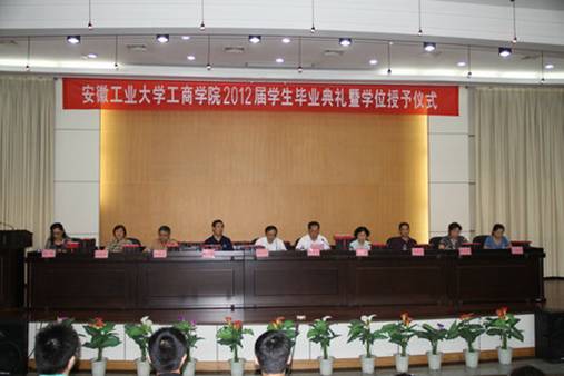 在庄严的国歌声中,毕业典礼正式开始。学生工作处处长祝红宣读了2012年“安徽省普通高等学校品学兼优毕业生”和“安徽工业大学工商学院优秀毕业生” 获奖同学名单。院领导依次为38名省“双优生”和64名院“优秀毕业生”颁发了荣誉证书。
