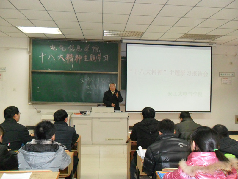 1月10日,电气信息学院邀请校关工委副主任卞征泰老师在教北305主讲“十八大”精神专题辅导讲座,学院党委中心组成员、各系、室支部书记,全体辅导员及各学生支部全体党员参加了此次讲座。