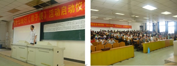 5月22日下午,数理学院在东校区阶教201室举办数理学院学习力行《弟子规》活动启动仪式暨开课典礼。数理学院党委书记俞锦超、党委副书记、副院长林忠心、团委书记张国、辅导员刘菲应邀出席,院2012级全体学生和2011级各班班干部参加了此次活动。活动由2012级新生辅导员戴少刚主持。