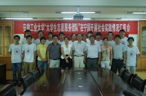 当天下午,俞锦超同志一行参加了由实践单位安排举行的“安徽工业大学数理学院赴宁国暑期社会实践工作汇报会”。会上,与会同志首先听取了宁国市民政局关于创新社会管理,加强社区管理与社区服务综合信息平台建设情况的介绍。数理学院光信息科学与技术专业1班张蓓、数学与应用数学专业1班游伟青代表13名参加暑期社会实践的同学汇报了10天来的工作情况和收获。宁国市社区负责人对学生的工作表现做了点评,他们一致认为数理学院学子能够吃苦耐劳,为社区信息化平台建设和志愿者服务工作贡献了力量,表现十分优异。随后,宁国市民政局、团市委、城管局的领导分别发言。他们对数理学院领导、师生的到来表示欢迎和感谢,一致认为13名学生展现了当代大学生的青春风采,履行了大学生暑期“三下乡”活动的宗旨,体现了不怕困难,紧密联系群众,为人民服务的优秀品质,为宁国社区事业的发展付出了心血和汗水,取得了优异的成绩。
