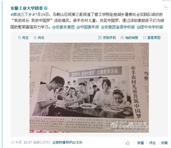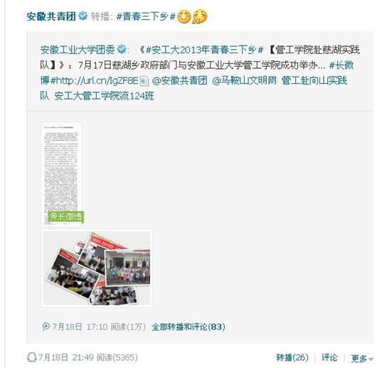 安徽工业大学管工学院暑期社会实践队于7月17日与慈湖乡政府部门成功举办了主题为“我的成长 我的中国梦”大型励志教育活动,安徽工业大学团委官方微博和马鞍山日报先后报道了此次活动。随后安徽共青团官方微博予以了转播,目前阅读量已超过一万。(撰稿:周爱军 审核:徐柳根 )