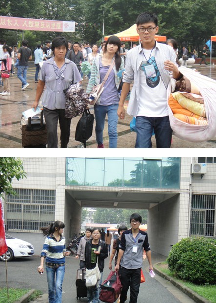 志愿者们活泼、热情,以自己的言行感动着每一位新生和家长。“迎新的志愿者队伍很庞大。在迎新过程中,很多学弟学妹对我们都很信任,学生家长对我们的帮助也非常满意。有些家长还说我们服务态度特别好,服务特别到位。虽然有点辛苦,但是听到他们的感谢和赞许,心里依旧很开心,很满足。”计1142班何佩佩同学说完这些话,又跑去接待新生了。