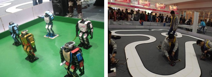 在本届博览会中,我校选手参加了“机器人•未来伙伴”专场秀表演。来自电气与信息工程学院的功夫小龙队和屹然队、来自计算机科学与技术学院的长江一队和探索一队分别给大家带来了主题为“中国功夫”、“爱情”、“双人舞之对花”、“男儿当自强之舞剑”等精彩的机器人创意舞蹈表演和智能车表演。两场表演都受到了现场参展观众的热烈掌声。