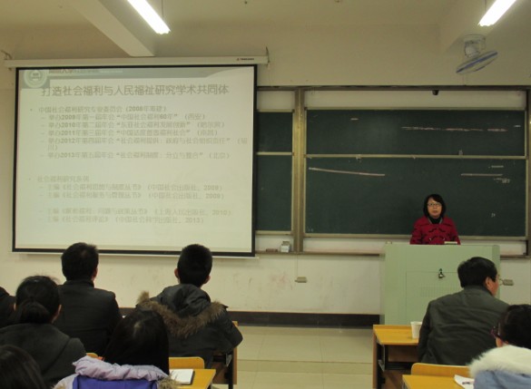 彭华民结合自己多年来求学、教学、研究的人生经历,与同学们畅谈了学问与人生的体会和认识。彭老师把学问人生总结为“理想目标、美好拥有、顺利避免、成功行动、幸福感受”二十个字。彭老师认为“做学问是一种精神劳动,学习过程总充满着美好的梦想,需要一生去坚持,要做到终生自觉学习,实现自己的人生价值。”鼓励大家进行继续教育。关于“儿童社会福利”的理论演讲,彭老师从儿童社会福利的研究背景、研究问题、文献回顾、福祉的概念、社会建设、政策框架等方面进行了深入细致的介绍。彭老师与同学们作了深入的互动交流,现场回答了同学们提出的相关问题。彭老师的报告深入浅出,旁征博引,以她广博的学识和精彩的语言表达,给同学们上了生动而难忘的一课。