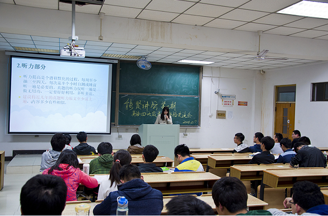 会前,辅导员徐悦和尚全邀请了向秋炜、何流、童子昂、鲍胜楠、鲁珍珍、武梦娇等六位本年级英语四六级考试获得高分的同学走上能贤讲坛,讲述他们的复习之路和应考经验。六位同学分别就英语学习兴趣、大学英语学习、四六级复习技巧、考试备考技巧、考试流程等方面,结合自身经历向大家做了详细说明。