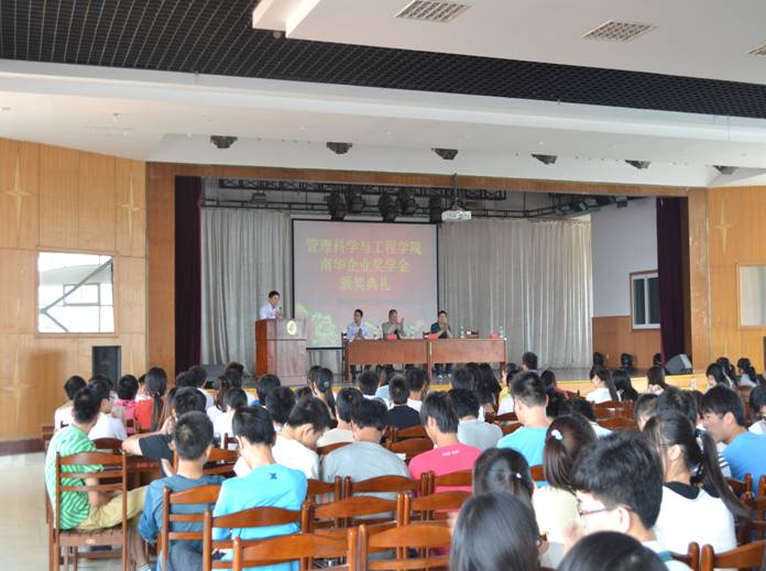 5月22日下午,管工学院39名“学霸”在秀山校区旧大学生活动中心参加了2012-2013年度“南华奖学金”颁奖典礼。安徽皖南电机股份有限公司许权副总经理、管工学院党政领导以及三百多名学子的见证了他们的授勋仪式。