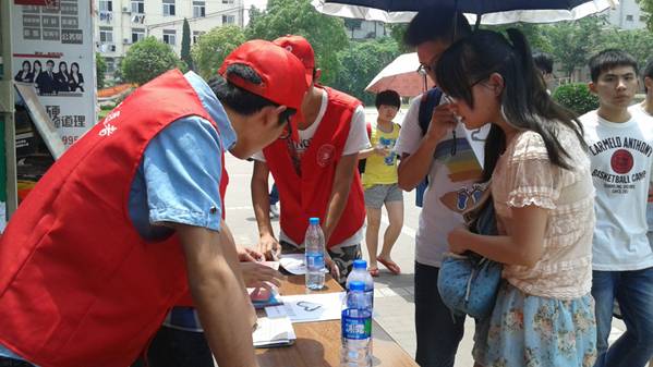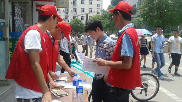 当日中午,烈日炎炎,身穿红马甲、头戴小红帽的管工学院志愿者协会的4名同学在我校秀山校区六食堂门前已做好准备,迎接前来参与活动咨询的同学们。