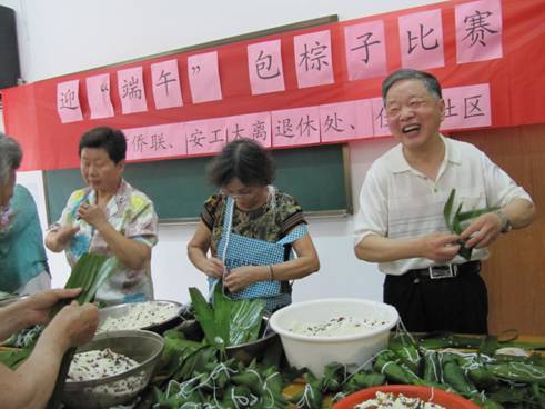 在中国传统节日端午节即将来临之际,我校离退休工作处与市侨联、佳山社区联合举办包粽子比赛。5月29日上午9:00,来自安工大、市侨联和佳山社区的老同志代表19人分2组参加了比赛。在离退休工作处副处长李波一声令下,选手们麻利地拿起粽叶,迅速地卷成一个漏斗型,放上米、红豆和蜜枣,再加米,然后用手压实,翻折粽叶用棉线缠紧,这样一个三角形的粽子就包好了。
