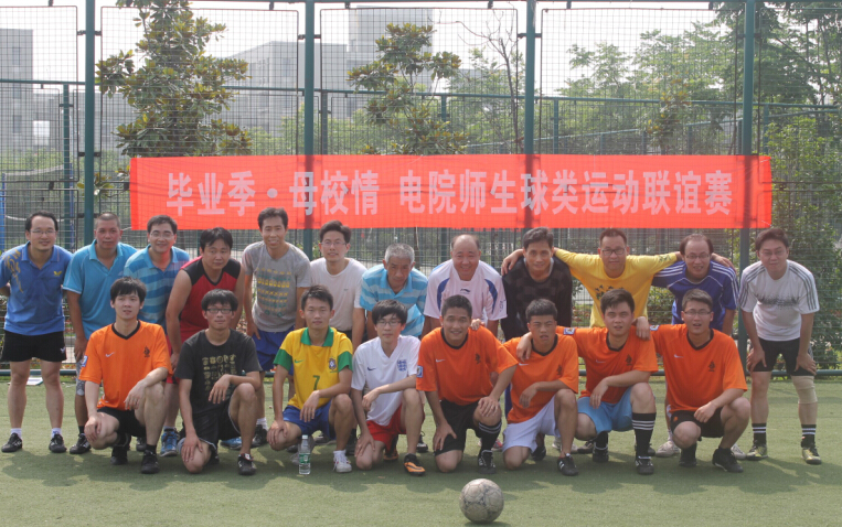 6月19日上午,电气与信息工程学院2014届毕业生与老师在东区运动场进行了一场精彩的毕业足球友谊赛。院党委副书记郭宏和爱好足球的老师与同学们同场竞技,分享比赛的乐趣,许多大四的同学们到场呐喊助威。