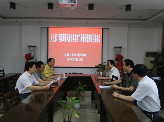 6月25日下午,商学院作为国家人社部专业技术人才知识更新工程2014年高级研修班“国际商务风险及其防范”培训项目的具体承办单位,邀请了马鞍山市人社局和我校人事处的有关负责同志,召开项目培训工作筹备会议,共同商议项目筹备工作。会上商学院领导首先通报了学院前期所做的一些准备工作。对于承办本项国家级的培训项目,全院上下高度重视,选派精干力量参与相关准备工作,认真按照项目要求研讨培训内容,细致考虑项目培训的各个环节,力争将本次培训项目办出特色、办出水平,进一步提升安徽工业大学的影响力。马鞍山市人社局、我校人事处的有关负责同志对商学院为本项目在前期所做的大量工作给予充分肯定,并就培训项目提出了一些具体意见和建议。结合有关文件精神,经商定,国家人社部专业技术人才知识更新工程2014年高级研修班“国际商务风险及其防范”项目培训工作将于今年8月下旬在我校举行。