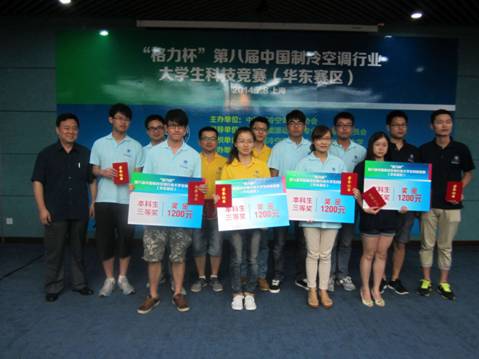 由中国制冷空调工业协会举办的第八届中国制冷空调行业大学生科技竞赛于近日在上海理工大学圆满落下帷幕。此次比赛分为团体实践技能操作、创新设计作品答辩、现场知识竞答(必答、抢答)三个环节。在第一个环节中,各代表队在上海格力公司进行实践操作比赛。第二个环节,各参赛队伍进行作品答辩。最终,我校学生王玉嵩、程建、董亚萌完成的作品“户式温湿度独立控制空调系统” 以其独特的节能环保理念获得三等奖。指导教师为张样和黄志甲。