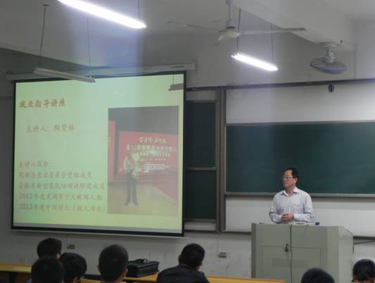 10月21日,校就业指导中心邀请荣获2013年度中国好人 (助人为乐) 称号、芜湖县农村人才培训中心陶贤林主任,为2014级新生做题为《企业人才素质要求与大学生的学业规划》的就业辅导报告会,电气学院、机械学院、商学院等学生工作负责人和部分辅导员听取了报告。