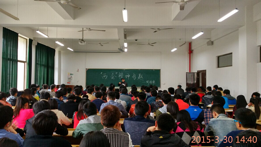 周国荣教授首先介绍了两会召开的基本情况,从2014年政府工作回顾、2015年政府工作总体部署及2015年政府重点工作三个方面,详细解读了李克强总理所作的2015政府工作报告。讲座深入浅出,内容丰富又有理论深度,学生反响热烈。