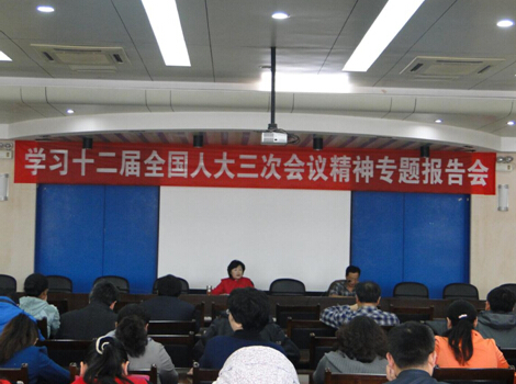 3月30日下午,商学院在佳山校区学术会议中心二楼报告厅举行学习十二届全国人大三次会议精神专题报告会。十二届全国人大代表杨亚达作专题报告,会议由院党委书记李致平主持,全院教职工参加了本次报告会。