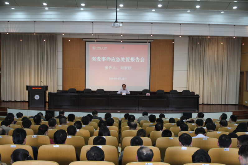 4月22日下午,学校召开突发事件应急处置报告会,校党委书记刘新跃作专题辅导报告。会议由校党委副书记陈润主持,全校副处级以上干部、全体辅导员和各学院团委书记参加了会议。