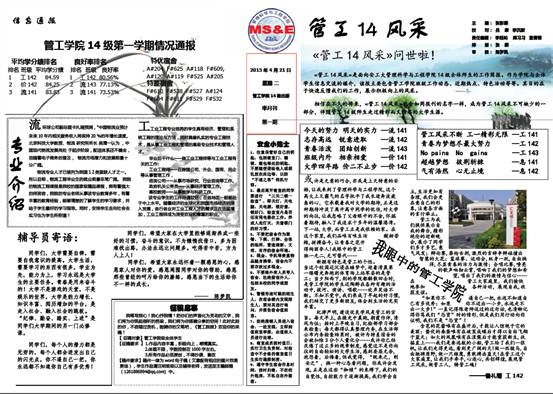 为进一步加强管工学院2014级学风建设、宿舍文化建设、先进班集体创建,增强学生对学院的认同感和归属感,在学院领导的指导下,管工学院2014级创办年级工作简报《管工14风采》。