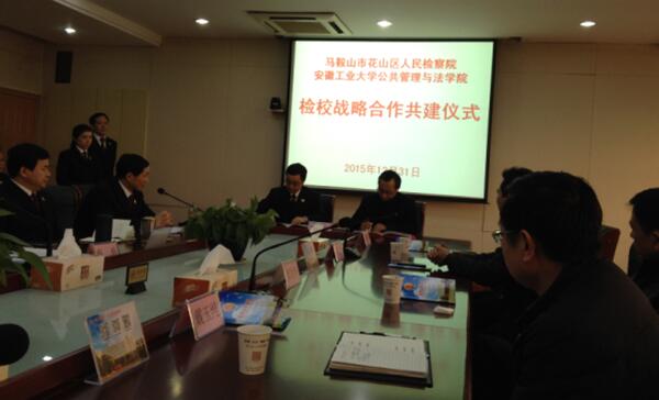 近日,马鞍山市花山区人民检察院与公共管理与法学院战略合作协议签字仪式在花山区检察院会议室举行,马鞍山市检察院政治部宣传处处长王京京,校党委委员、发展规划处处长戴玉纯,公共管理与法学院党委书记曹世华、院长张洪根,区检察院检察长蔡勇等出席签约仪式并致辞。