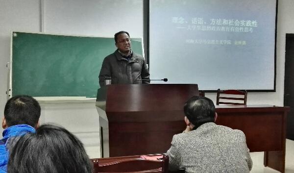 为进一步提高我校思想政治理论课教师课堂教学能力和科研教学成果转化水平,推进思想政治理论课课堂教学改革,增强教学的针对性和实效性,12月26日下午,在秀山校区汇文楼A楼308报告厅,马克思主义学院特邀河海大学教授、博导金林南博士为学院全体师生作思想政治理论课专题学术讲座。讲座由学院副院长高敏教授主持。
