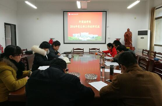 1月5日下午,外国语学院党委召开党委扩大会议,学院6个党支部开展2016年度工作述职交流。学院党委副书记黄宇弦主持了支部工作述职交流活动。