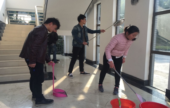 为迎接雷锋日的到来,3月4日,材料学院团委书记滕少聪带领该院团委学生会全体干部对新大学生活动中心进行志愿清扫活动。