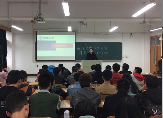 讲座中,杜飞首先介绍了安徽工业大学历史和马鞍山城市精神,随后重点从“有理想,有追求,有担当,有作为,有品质,有修养”六个方面,结合共青团主要任务、暑期社会实践、科技创新比赛、新媒体宣传和自身经历与大家分享交流,鼓励同学们学会自我分析,学会用联系的、发展的、辩证的眼光看问题,全方位培养自己,在学习工作中争做先锋。