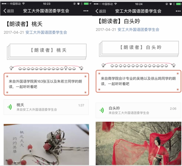 艾默生说“读书时,我愿在每一个美好思想的面前停留,就像在每一条真理面前停留一样”,在4月23日世界读书日之际,外国语学院推出一系列朗读经典活动,邀请各个学院的优秀学子用中英双语,朗读经典,在安徽工业大学外国语学院团委学生会微信公众号(ahutwgy)推送,打造了一个微信版工大“朗读亭”。