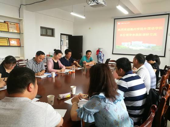6月2日下午,滁州学院外国语学院院长程家才、副院长祁世明、副院长葛厚伟一行来我校调研交流本科教学工作审核评估评建工作。外国语学院院长洪流主持交流会,学院党委副书记、副院长黄宇弦,副院长曹瑞斓及各系部室负责人参加了座谈交流。