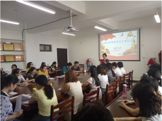 6月8日下午,外国语学院在汇文楼B502室隆重举行新党员宣誓、老党员重温入党誓词仪式,莅临这次宣誓仪式的有学院党委书记胡卫东,院党委副书记黄宇弦,全体辅导员及学生党支部全体学生党员,会议由辅导员张美玲主持。此次大会是对预备党员进行党的教育一种有效形式和实践方式,是新党员人生道路的一个新的里程碑。
