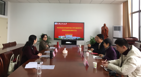 11月30日上午,北京信息科技大学外国语学院副院长张广奇一行4人来我校调研交流专业发展和学科建设等工作。外国语学院副院长曹瑞斓主持交流会,副院长陈琳和相关人员参加了调研交流。