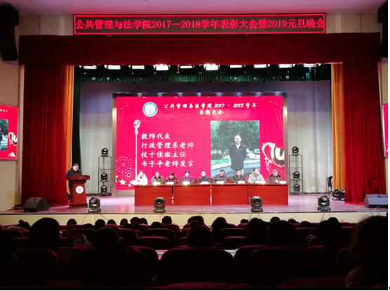 12月28日晚,公共管理与法学院于秀山校区新大学生活动中心举行2017-2018学年学生表彰大会暨2019年元旦联欢晚会。学院党委书记曹世华,院长张洪根,院党委副书记、副院长李萍,副院长许克祥,各系系主任,班主任以及400余名学生参加了此次活动。