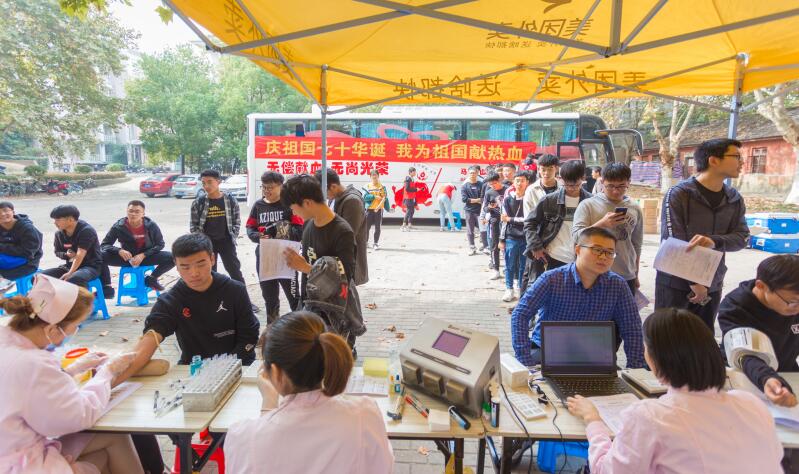 活动分别在秀山校区和佳山校区举行。献血车到达前,大学生志愿者们已经拉开横幅,撑起帐篷,摆好桌椅,做好一切准备工作。校青年志愿者协会会长危静表示,“在新中国成立70周年之际,我们通过举办无偿献血活动向祖国献上最真诚的祝福,非常有意义。”前来参加献血活动的学生络绎不绝,大学生志愿者们指导参与献血的同学们认真填写献血单,聆听献血中心医生和护士们讲解注意事项,有序完成血样化验。在志愿者的引导下,依次走上献血车,卷起衣袖捐献热血、奉献爱心。在参加义务献血的青年学子中,既有第一次参加献血的2019级新生,又有多年坚持献血积极参与献血活动的高年级学生。校学生会主席范浩东说:“用我的鲜血去帮助别人,去挽救那些濒危的生命是一件很光荣的事,也是我们青年学生用行动对祖国表达爱意的一种方式。”马鞍山市中心血站领导和医生高度赞扬了我校学子的爱心和社会责任心。为组织好此次活动,校青年志愿者协会提前邀请马鞍山市中心血站医生专家举办了知识讲座,宣传无偿献血及造血干细胞相关知识和注意事项。