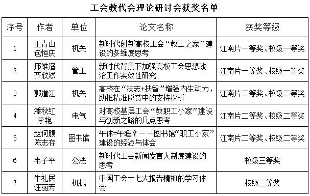 校工会选送的五篇论文获得一等奖2篇,二等奖3篇。2019年,校工会开展了工会教代会第十次理论研讨,评选出优秀论文多篇。经校工会研究,坚持好中选优的原则,遴选了五篇优秀论文参加江南片高校第十七次工会教代会理论研讨会。(撰稿:许小虎 审核:姚敏 汪盛颜)