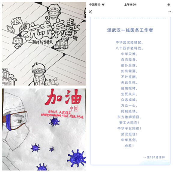 防控疫情阻击战,是一场人民的战争,也是一场心理战役,一线的“战士”争分夺秒与病魔战斗,同时间赛跑。后方,数理学院分团委在学院党委的指导下组织广大青年学生开展线上战“疫”活动:普及新冠肺炎知识,宣传防疫措施,给一线“战士”手写祝福语,发表疫情期间感想等。学院组织各个班级征集防疫宣传海报、原创诗歌、感人故事,希望同学们以关爱之心,以微薄之力与社会各界一同抗疫,共克时艰。通过作品的形式呈现对新型冠状病毒的认识、防控疫情的正确做法和表达对战胜疫情的坚定信心。