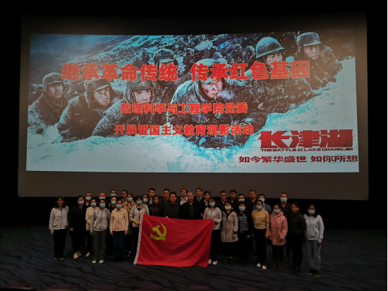 为进一步弘扬爱国主义精神,持续深入开展党史学习教育,加强党员的党性修养,激励教师不忘初心、牢记使命、爱国敬业,珍惜当前幸福生活。10月16日下午,数理科学与工程学院党委组织教职工党员开展爱国主义教育观影活动,观看电影《长津湖》。