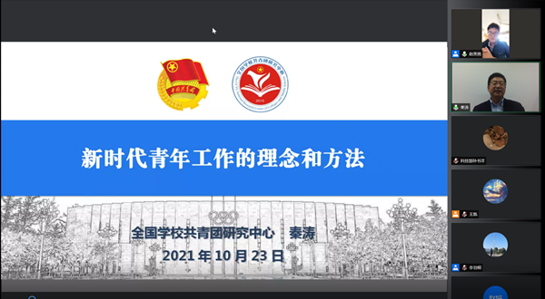 为促进“青马工程”学员了解新时代青年工作的理念与方法。10月30日,校团委邀请全国学校共青团研究中心秦涛教授线上作《新时代青年工作的理念与方法》的专题培训,全体学员参加。