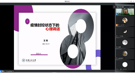 4月25日,我校第36届“我爱我(5.25)”心理健康月活动在线上开启。校学工部副部长、心理中心主任王军教授做“疫情封控状态下的心理调适”专题讲座,500名师生通过腾讯会议聆听讲座。