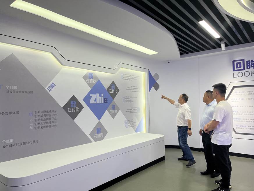 7月19日上午,安徽瑞泰智能装备有限公司总经理舒金林一行到马鞍山大学科技园考察,安徽工业大学科技园管理办公室主任、安徽工业大学科技园有限公司总经理王小林陪同参观了科技园展厅,随后在一楼小会议室座谈,机械工程学院黄建中博士参加座谈会。