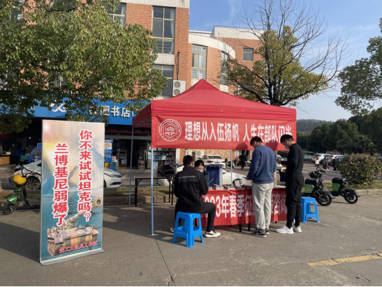 “征兵号角唤热血男儿情强军战歌奏强军复兴梦”等满怀激情的征兵横幅在校园内赫然醒目,各类征兵宣传标语在学校、各二级学院电子屏持续滚动播放。校征兵工作站设立户外征兵咨询点、悬挂横幅、发放资料,并创新运用了“新媒体+征兵”模式,在学校官方微信和学工部、团委等部门微信平台,精心创作推送“理想从入伍扬帆,人生在部队闪光——致2023届全体毕业生一封信”,积极开展全方位征兵宣传。做到征兵宣传“全方位、无死角、全覆盖”。