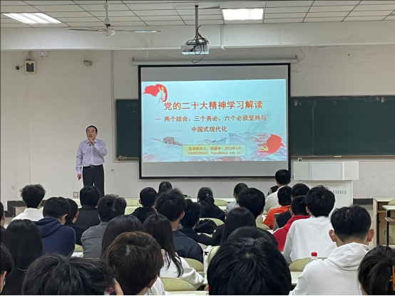课堂上,胡源申从中国共产党的性质、党的指导思想展开,旁征博引,深入浅出,使同学们真正掌握了党的核心,党的先进性以及党的行动指南。他强调,要想学懂、学好党的二十大精神,巩固党的基本理论知识是十分有必要的。接着他着重讲解了党的二十大报告中的“两个结合”、“三个务必”、“六个必须坚持”以及中国现代化的内容。最后,胡老师要求同学们加强理论学习,正确理解党的先进性,全面认识党的领导核心地位。作为入党积极分子一定要端正入党动机,提高思想觉悟,将党课学到的知识运用到日常学习和生活中去。
