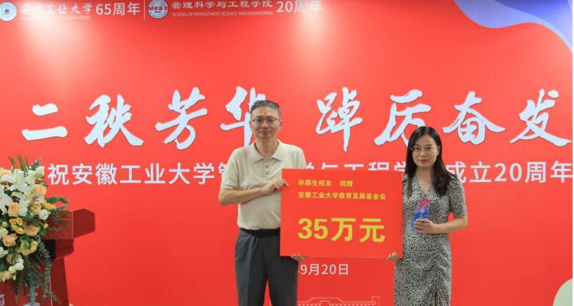 会上,汪和平、王军分别向安徽夺冠体育科技有限公司董事长2013届校友陈志栋、江苏艺特新能源科技有限公司董事长2006届校友孙照生等颁发了捐赠“特别贡献奖”。据悉,陈志栋、孙照生两位校友累计向学校、学院捐赠75万元。