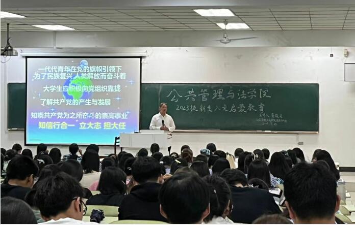 9月25日,公共管理与法学院专门邀请蔡保兴教授为2023级全体新生开展入党启蒙教育。