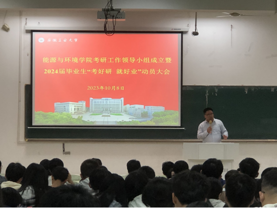 为助力毕业生考研就业,能环学院于10月8日召开考研工作领导小组成立暨2024届毕业生“考好研就好业”动员大会。院党委副书记、副院长卫军帅,院团委书记钱春梅,学院全体毕业生参加。会议由毕业班辅导员吴飞主持。