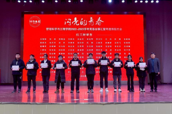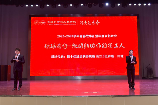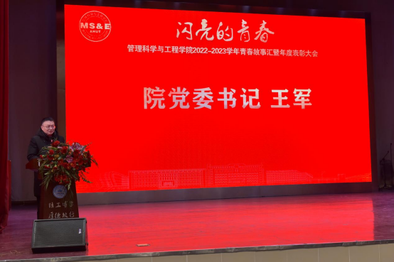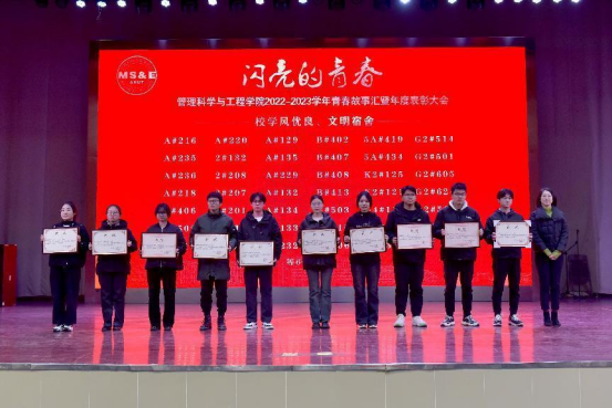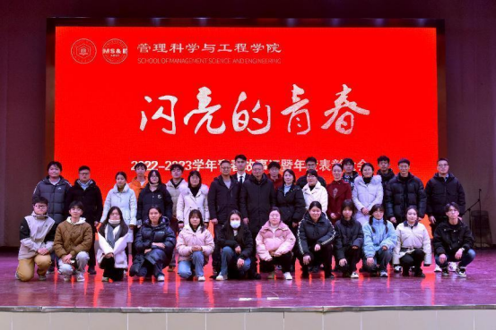 12月25日晚,管理科学与工程学院举行2022-2023学年青春故事汇暨年度表彰大会。校党委宣传部副部长、校团委书记王菁、学生工作部(处)部长赵龙、研究生院、团委、教务处等相关职能部门负责人,管工学院党政领导班子、系室主任、教师代表、班主任代表以及全体辅导员、受表彰的先进集体和先进个人及各年级学生代表共400余人参加大会。表彰大会由学院党委副书记、副院长、纪委书记赵颖、2021级辅导员任静、工业工程203班王枫主持。