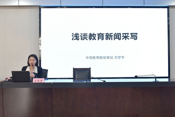 为提升校园新闻通讯员业务能力,开创学校宣传工作新局面,根据学校“新闻宣传‘四力’讲堂”活动安排,3月21日上午,中国教育报记者方梦宇应邀来校作“浅谈教育新闻采写”专题培训。学校党政管理机构、教辅机构、直属单位、教学机构的教师通讯员,新媒体中心记者团成员以及新闻宣传工作爱好者现场聆听。讲座由党委宣传部副部长王菁主持。