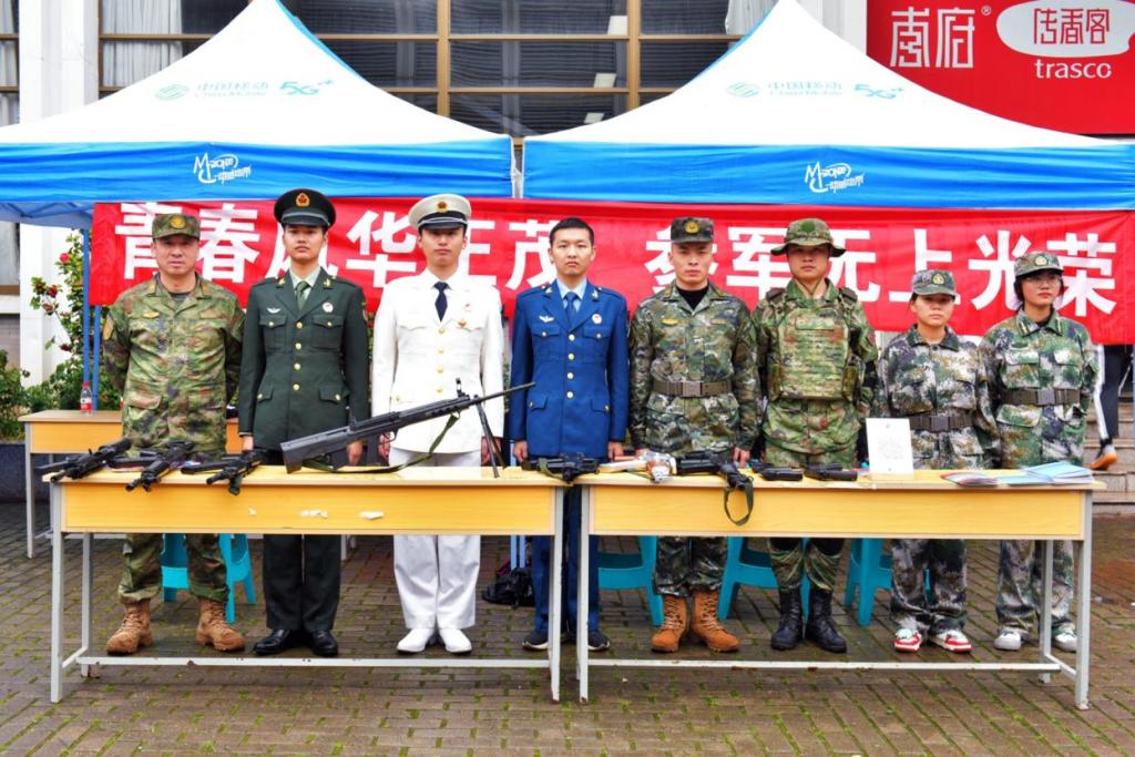 校“迷彩宣讲社团”退役大学生士兵身着陆军、海军、空军、武警等多套服装英姿飒爽亮相,另有六大兵种的十余件现役及退役装备模型吸引了学生驻足观看。在所有展出的军事装备中,最受欢迎的是各种枪支,难得看到这么真实的模型,同学们都跃跃欲试。“我觉得每个男生都有参军的梦想,我现场就报名了,如果能够顺利入伍,这肯定是我这辈子最光荣的事!”一位男生在试完一把88式狙击步枪后颇有感触地说。