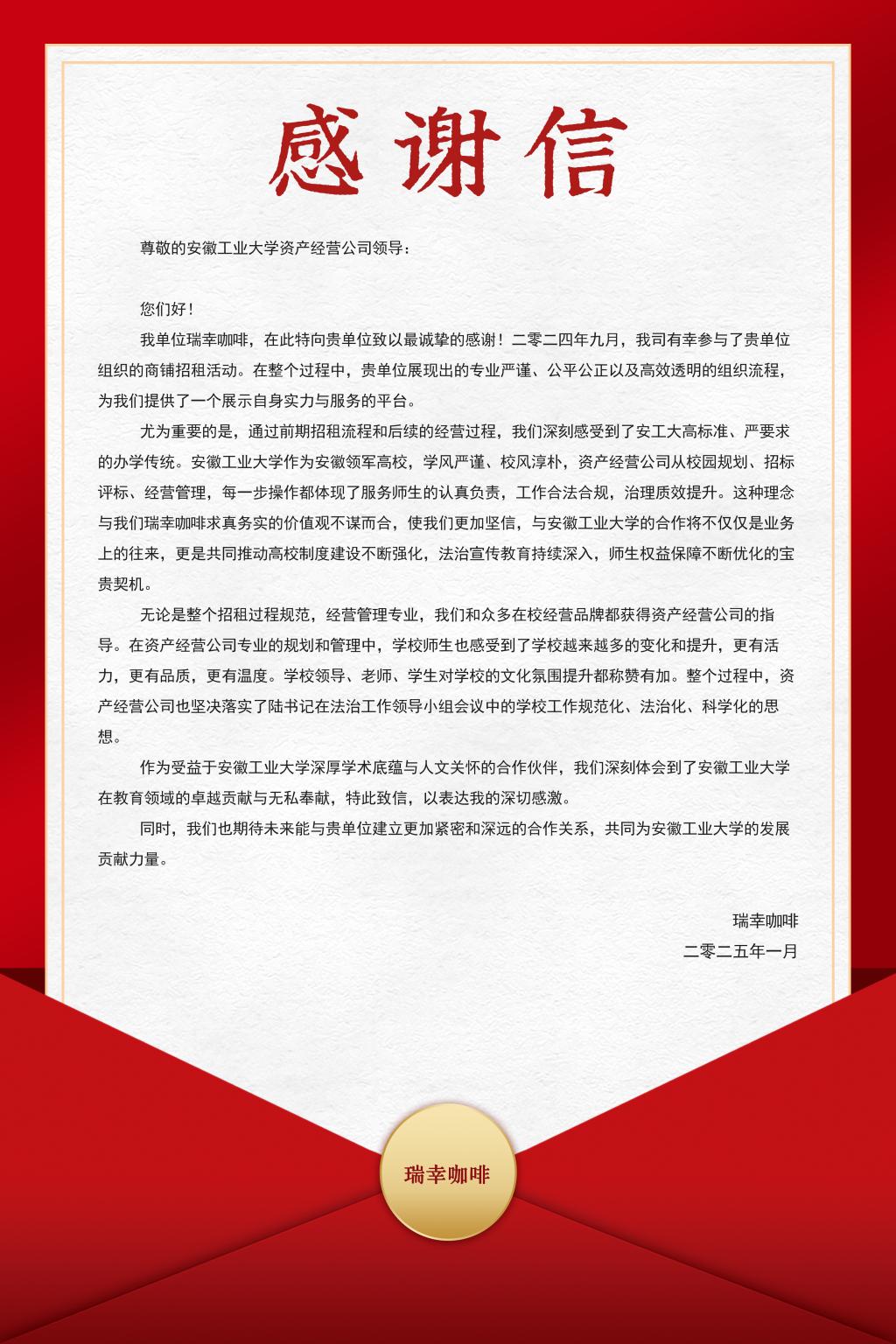 1月7日,瑞幸咖啡向资产经营公司赠送感谢信和锦旗,为资产经营公司在公平严谨的商铺招租流程和科学规范的经营管理活动表示肯定和认可,对于日常工作的有效指导表达诚挚感谢,为公司高效的管理工作点赞。