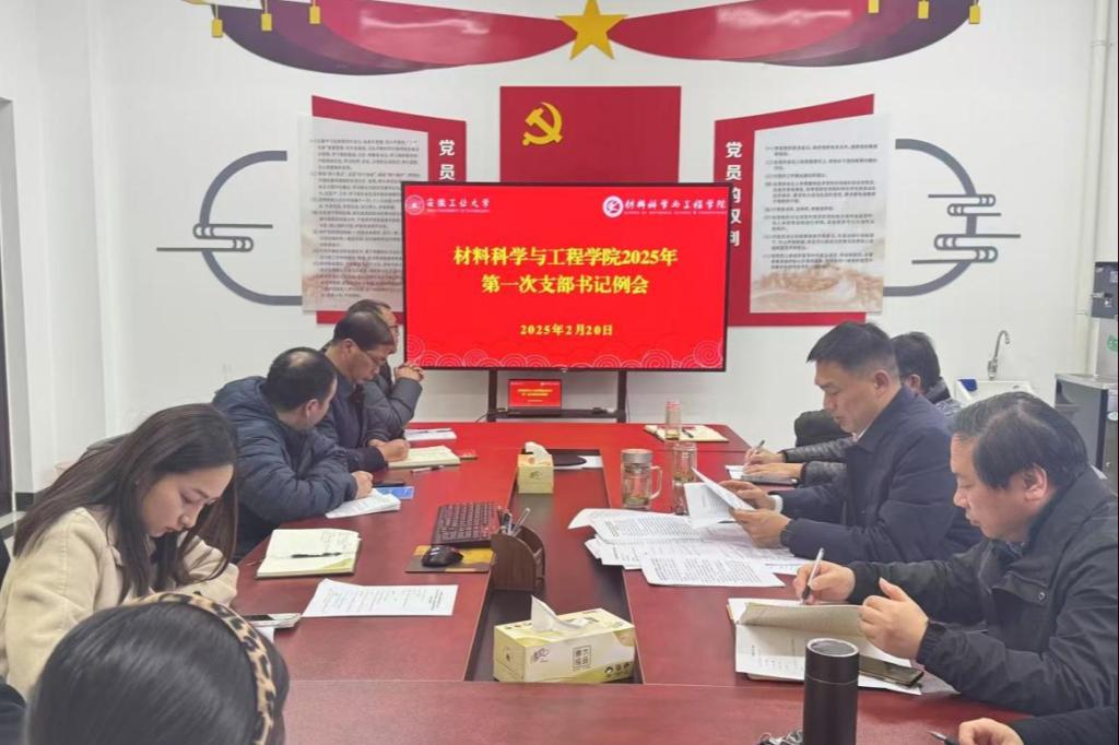 2月20日,材料科学与工程学院在材料南楼405会议室召开了2025年第一次党支部书记工作例会。会议由学院党委书记杨建主持,院党委副书记、院长柳东明,院党委副书记、纪委书记、副院长汪盛颜,副处级组织员郭道江和全体党支部书记出席了会议。