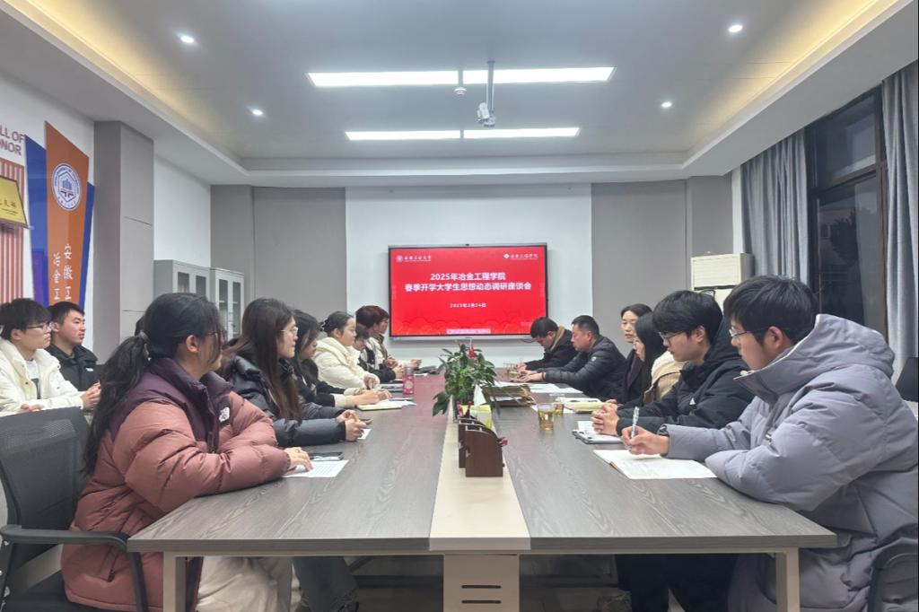 为深入把握新学期学生的思想状况和学习生活情况,2月24日下午,冶金工程学院在冶金楼南318会议室召开2024年春季学期学生思想动态调研会。院党委副书记、纪委书记、副院长朱艳飞,院团委书记张夏以及各年级学生代表参加本次会议。