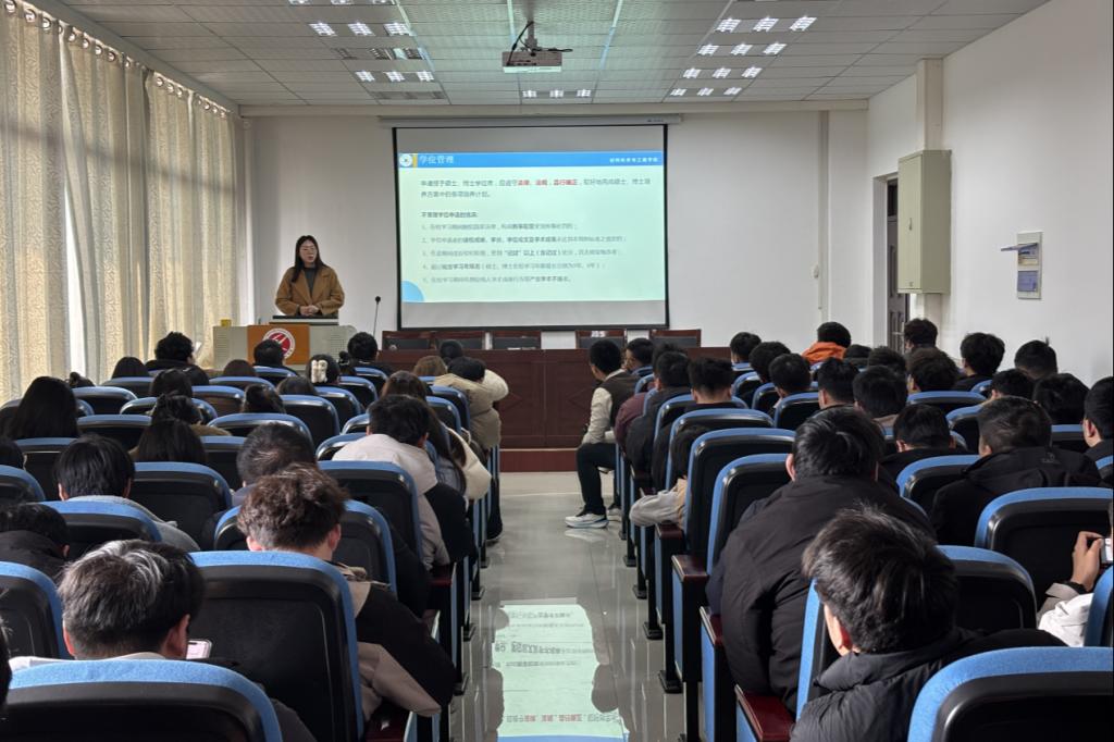 辅导员李盼针对研究生日常学习与管理关键环节,进行了说明。提醒同学们严格遵守校规校纪,及时办理请销假、校外租房、实习、联合培养等手续。重点解读了硕士、博士学位申请的基本条件,期望同学们合理规划学业与科研进程,确保按时完成学业。