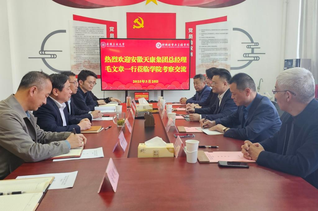 3月25日,安徽天康(集团)股份有限公司党委副书记、总经理毛文章,副总经理徐成业,纪委书记、办公室主任马林,人力资源部部长徐宏勤,电气贸易公司经理王汉奎一行到材料科学与工程学院座谈交流,校企双方就党建合作和产教融合达成意向性协议。材料科学与工程学院院长柳东明,党委副书记、纪委书记、副院长汪盛颜,副院长李永涛及教师代表参加座谈交流会。座谈交流会由汪盛颜主持。